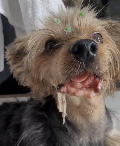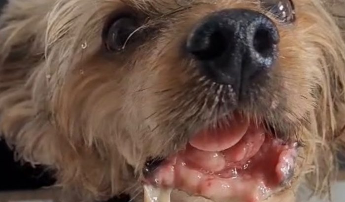Um tumor na boca cresceu tanto que ele já perdeu parte da mucosa da boca e mandíbula de tecidos que já estão necrosados devido ao avanço do tumor que é muito agressivo ele não consegue mais comer sem sentir dor e nem água ele consegue mais tomar ! Ver ele tentando se alimentar e não conseguir é de partir a alma.