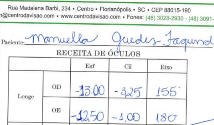 Manu usa óculos desde 01 ano e 08 meses, em função do grau o custo sempre é elevado assim como os colírios.