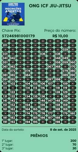 Estamos realizando uma rifa solidária para ajudar a custear as inscrições dos nossos atletas no campeonato. Assim, toda a galera terá a oportunidade de participar desse momento tão importante, sem que a questão financeira seja um obstáculo para a equipe. Cada bilhete comprado é mais do que uma chance de ganhar um prêmio: é um investimento no futuro dessas crianças, adolescentes e jovens, ajudando a fortalecer sua educação e o amor pelo esporte!!!🥋🔥