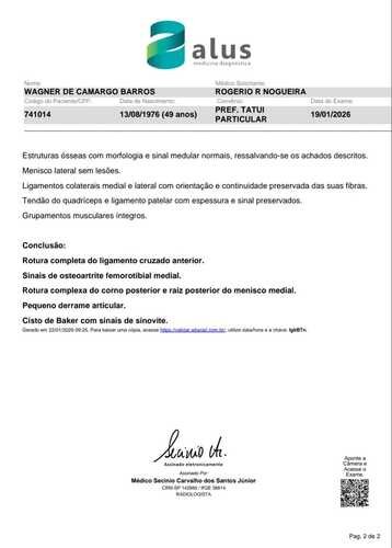 Eu sou o Waguinho e fui no dia 17/04/2024 no UPA com muita dor no.joelho após um choque e la depois de 2 dias internado fui liberado , sem nada segundo a médica de plantâo e com guia para fisioterapia porém a dor presistiu , fui em um ortopedista no mes 10 de 2024 onde fui encaminhado para o Sus , esperei chama até mes 01 / 2026 sem.dinheiro para o Exame fiz uma Rifa e ao sair o resultado me deixou muito triste , Estou com 2 LIgametos rimpidos , Derrame arterial , Cisto de Baker e Ostreoartrite devido ao Tempo que passou Complicou para mim , mais Desus esta no.controle peço a todos que ler este pronunciamento que Deus toque no coração e me ajude quanto mais o tempo passa mais.fica dificil pela minha idade , que Deus abençoe poderosamente a todos que sentirem de ajudar eu , estarei apresentando notas.de tudo , Por favor 🙏 Preciso fazer a cirurgia urgente.