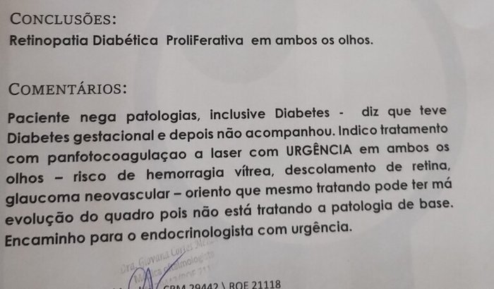 No dia 07/04 fui diagnosticada com Diabetes, que afeto a minha visão corro risco de hemorragia vitrea, descolamento de retina e glaucoma neovascular nessecito de um tratamento a laser com panfotocoagulacao aonde pelo Sus demora e preciso urgente fazer cada sessão custa 1980.00 preciso de 2 sessoes em cada olho 7.920 reais conto com a ajudar de todos que Deus abençoe grandemente cada um