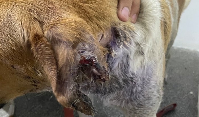 Levamos ele ao veterinário e, graças a Deus, já recebeu todos os cuidados 💉❤️Ele está bem machucadinho e perdeu a orelhinha 😔, mas não sente mais dor e está sendo muito bem cuidado!