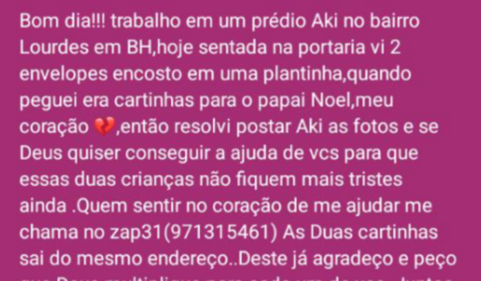 Boa tarde pessoal!!peço a ajuda de vcs pois encontrei duas cartinhas para o papai Noel hoje,na portaria do prédio onde trabalho,nela as crianças pedem alimentos,biscoitos,a cesta básica,um jogo de copo,e uma ajuda para trocar o óculos de gr ver tudo