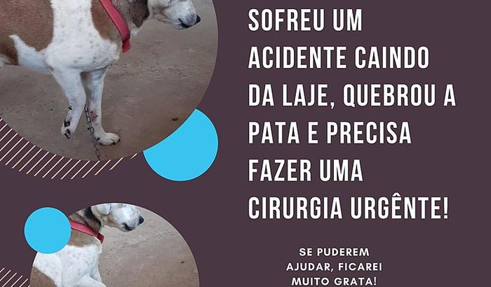 Meu cachorro sofreu um acidente e caiu da laje e infelizmente quebrou umas da pata dele, levei ele em uma clínica veterinária, e irá precisar fazer uma cirurgia, mas infelizmente não tenho condições, e preciso de ajuda pra fazer a cirurgia dele, Muito obrigada!