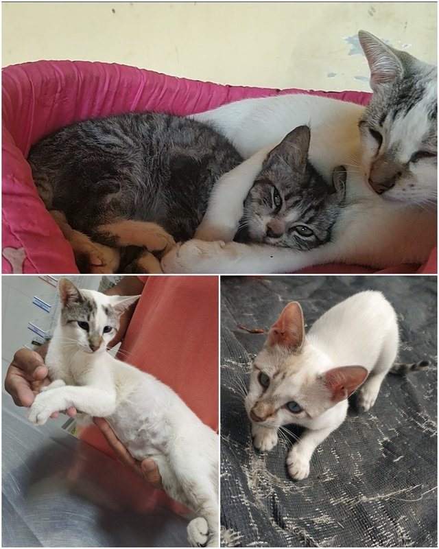 Recentemente apareceu mais 2 gatos, uma é fêmea filhote, o outro e macho aparenta ter 6 meses, o macho já foi castrado chamando de sansão (branco)