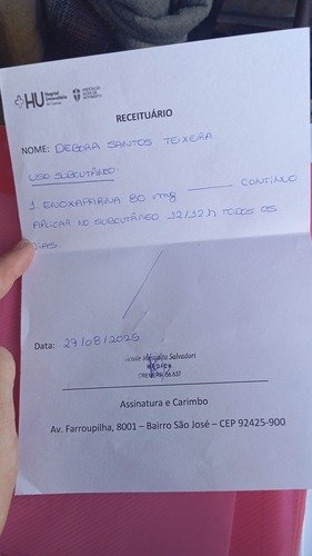 Meu nome é Débora.Tive uma trambose ocular no começo deste ano e estava fazendo o tratamento quando descobri que estava grávida.Por conta do episódio de trambose minha grávida é de alto risco.Atualmente estou com 6 meses de gestação e para salvar a vida minha e do meu bebê para ocorrer tudo bem preciso aplicar diariamente uma injeção subcutânea duas vezes ao dia enoxaparina de 80 mg.Estou encaminhando pelo Estado porém demora.E preciso começar o tratamento o mais rápido possível.Qualquer ajuda neste momento é uma benção de Deus na minha vida e do meu pequeno João Gabriel que está no meu ventre.