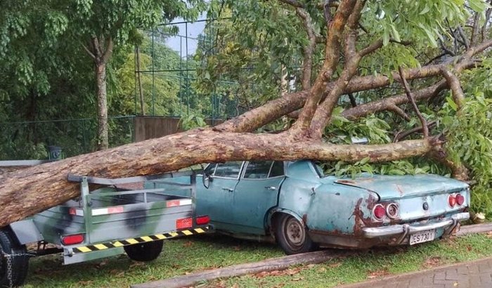 O Mário Henrique da Feirinha dos Produtores Rurais de Sobradinho, teve seu carro destruído por uma árvore que caiu durante o vendaval da última quinta - feira no Condomínio RK,