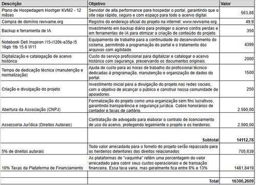 O projeto é totalmente sem fins lucrativos e será administrado com transparência e responsabilidade.Todos os valores arrecadados serão aplicados conforme o plano apresentado, e as etapas de execução serão divulgadas publicamente no site e nas redes sociais do Revivame.org.
