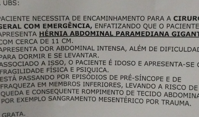 Estamos tentando pelo menos operar a ernia que ele tem na barriga que está com quase 12 ctm é oq encomoda muito ele .ele tá com falta de ar tá bem debilitado fraco das pernas tenho medo dele cair e estourar tudo por dentro dele.e sem contar com tamanho e peso ele reclama que dói que coça..por favor eu quero ajudar ele ..e não temos condições