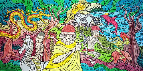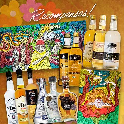 15 - agradecimento + ingresso para a festa + 1 reprodução em tamanho 40cmx30cm e papel couché do quadro "Tom e a Mata" + 1 reprodução em tamanho 40cmx20cm e papel hahnemühle matt fibre 200g do quadro "Os mitos e a mata" + 1 arte original em tamanho aproximado de 84cmx59cm desenvolvida pelo artista plástico Gui beck, autor de todos os trabalhos em exposição no Boteco matita Perê + 1 garrafa de Cachaça Weber Haus 7 madeiras = R$ 900,00 (VENDIDO)