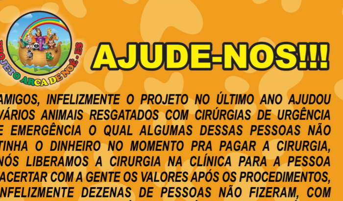 Infelizmente o projeto no último ano ajudou vários animais resgatados com cirurgias de urgência emergência o qual algumas dessas pessoas não tinha um dinheiro no momento pra pagar cirurgia nós liberamos a cirurgia na clínica pra pessoa acertar com a gente os valores apos os procedimentos , infelizmente dezenas de pessoas não fizeram com isso acumulamos dívidas altíssimas nas clínicas chegando a quase R$20.000 , quem puder nos ajudar a tentar juntar o valor pra poder quitar essa dívida agradeço imensamente para podermos continuar com o projeto e ajudando centenas de animais por mês 🙏🏻🙏🏻🙏🏻🙏🏻