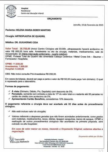 Pois precisa da prótese, ela sofre com um desgaste que ocorre entre o fêmur e o quadril, resumidamente, esses dois ossos estão encostados, causando dor e impossibilitando ela de andar normalmente e viver a vida conforme gostaria. Esse valor que está na foto de R$18.750,00 é somente do orçamento do hospital, e os 10 mil são do médico, totalizando os R$28.750,00 para a realização do procedimento.