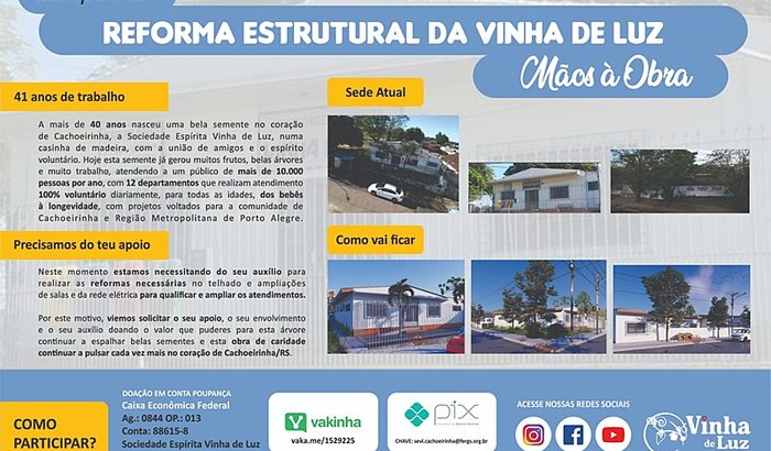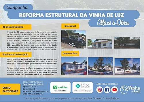 A mais de 40 anos nasceu uma bela semente no coração de Cachoeirinha, a Sociedade Espírita Vinha de Luz, numa casinha de madeira, com a união de amigos e o espírito voluntário.