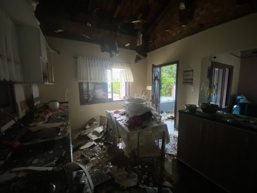 Tentando tirar alguns eletros e levar para os quartos mas quando nós temos por conta começou a cair o forro da casa toda e a água começou a entrar na casa pelo telhado, então deixamos tudo para trás e fomos nos abrigar no único cômodo que está intacto, nós fechamos os 5 e nossos 2 cachorros todos dentro do cômodo seco e ficamos ouvindo a água da chuva caindo dentro de casa e a queda do forro a noite e madrugada inteira. Na madrugada bateram em nosso poste arrebentando todos cabos de luz, o poste também está com risco de queda e estamos em constante contato com o pessoal da energia local, assim como o pessoal de fornecimento de água. No clarear da manhã logo ao parar a chuva iniciamos a remoção das sujeiras para ver o real estrago, tivemos anjos de luz, que foram meu irmão e minha cunhada, minha prima e o marido dela que viram nos ajudar com a limpeza e remoção do forro, tijolos e telhas. Após isso fomos vendo o que poderia ainda estar em funcionamento para tentar resgatar, a geladeira ainda não funcionou, os móveis da cozinha, banheiro, sala foram perdidos, o sofá e tapetes vamos tentar lavar para recuperá-los, eletros domésticos e eletrônicos que também pararam, mas pela graça divina de Deus estamos vivos e com saúde 🙏🏻.