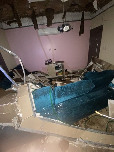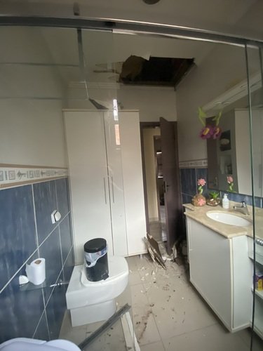 Coloquei algumas fotos, de como estava no início da quedo do banheiro e de um dos quartos depois caiu o restante e já não tínhamos mais luz, internet, nem bateria, aí falta os restantes dos ambientes.