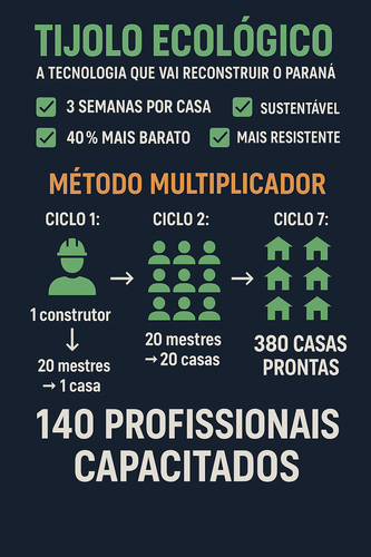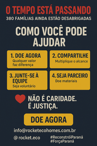 Reconstrói Paraná une esforços de voluntários, engenheiros e parceiros locais para planejar e erguer novas casas sustentáveis e resistentes. Cada doação será aplicada diretamente na compra de materiais, no transporte e na contratação de profissionais, garantindo segurança e dignidade a quem enfrenta dificuldades desde o dia em que tudo foi perdido.