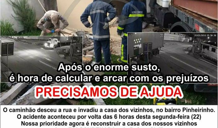 Ele e a esposa estão agora pedindo ajuda. “Nossa prioridade agora é reconstruir a casa dos nossos vizinhos. Foi uma tragédia pra nós e para eles, mas, felizmente, ninguém perdeu a vida. Pagamos um pouco mais de R$ 2 mil por mês da prestação do caminhão e não temos o dinheiro pra comprar todo o material da construção. Parentes da casa atingida já disseram que eles mesmos vão construir, mas deram a lista do que vai preciso e agora estamos correndo atrás e pedindo doações”, disse Andriele.