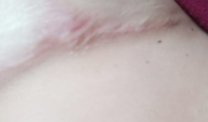 Está mesma cicatriz, também deixou uma parte do seio que agora é pequeno meio fundo.
