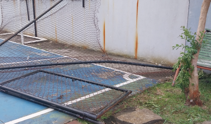 O último temporal de janeiro derrubou a nossa quadra, luga de lazer das nossas crianças.