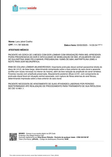 Há mais de 60 dias, estou praticamente presa à cama por conta de uma hérnia de disco severa. A dor é incapacitante – não consigo sentar, andar direito ou realizar tarefas simples. Depois de tentar diversos tratamentos sem sucesso, a única solução agora é a cirurgia.