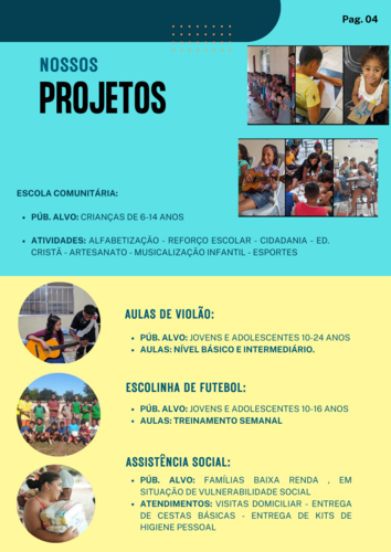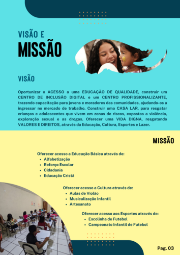 Através dos nossos trabalhos, nós estamos transformando a vida de crianças, tirando elas das zonas de riscos, como violência, abuso e exploração sexual, trabalho infantil, drogas e criminalidade, oferendo a elas acesso a Educação, Cultura, Artes, Esportes e Lazer, e assim, levar o direito de uma vida Digna para as comunidades e famílias que estão na linha da pobreza e extrema pobreza .