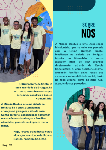 A Missão Cactus é uma Associação Missionária, localizada na cidade de Belágua, interior do Maranhão que, em parceria Grupo Geração Santa, e juntos atendem mais de 150 crianças diretamente, através da nossa Escola Comunitária, com aulas de Reforço, Alfabetização, Cidadania, Artesanato, Esportes, Musicalização Infantil, Educação Cristã e Aulas de Violão.