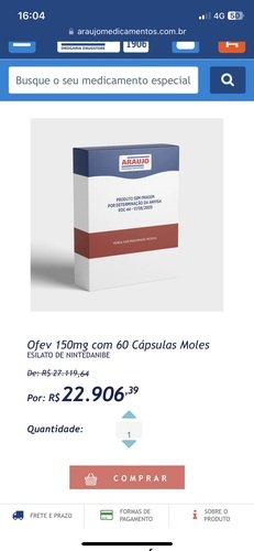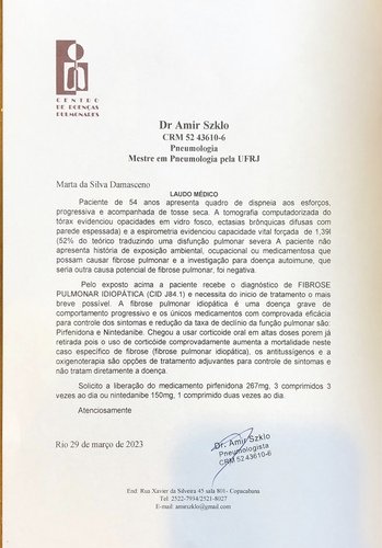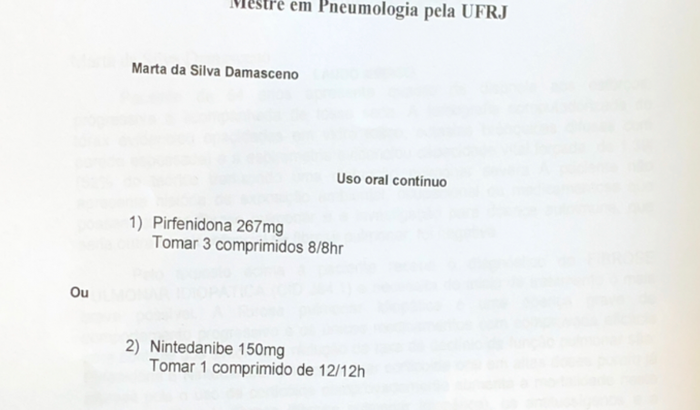 Desde o início do ano minha mãe vem tendo internações seríssimas por conta da fibrose pulmonar idiopática, que é uma doença que compromete grande parte do pulmão e infelizmente apareceu como sequela da COVID-19. Os únicos remédios que tem a comprovação para interromper o seu avanço são o NINTENDANIBE de 150mg ou PIRFENIDONA de 275mg, que custam em média 20.000 reais a caixa para apenas 1 mês de tratamento. Essas seriam as únicas medicações que realmente a ajudariam até a realização de um transplante pulmonar.
