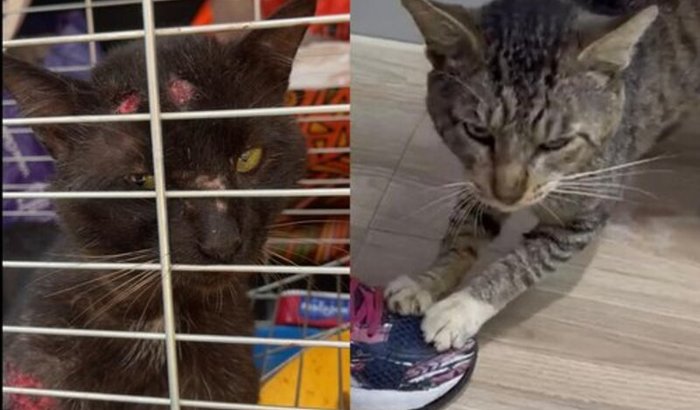 Enquanto fazíamos o resgate, um outro gatinho — o Rajadinho — apareceu sozinho, miando baixinho, pedindo ajuda. Ele entrou sozinho na caixinha de transporte, como se dissesse: “me leva com você”. E assim, ele nos escolheu.