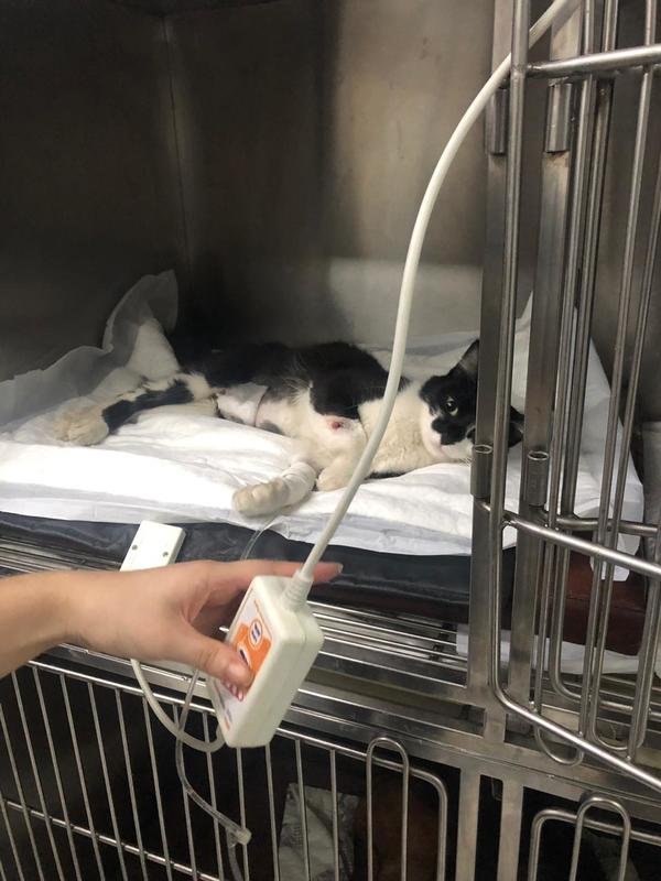 Ela fraturou a coluna, queebrou duas patas, e seu pulmao perfurou um pouco. Infelizmente perdeu todos os filhotes, mas estamos lutando pra que ela fique bem logo.