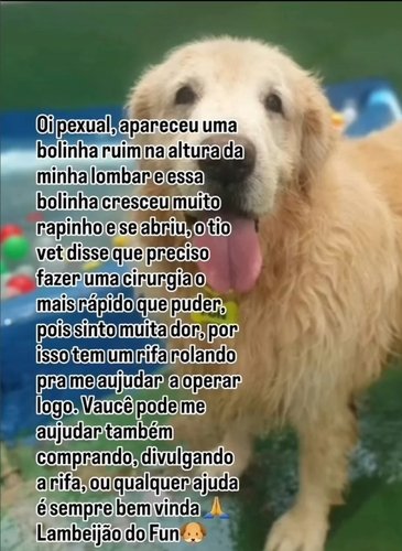 Olá pexual, eu sou o Fun Goldinho, sou um cão muito amado, esperto e inteligente. Sou um Cão de Suporte Emocional da minha mamis e terapeuta de vovozinhos, mas diferente de alguns cães de serviço eu quando estou sem meu colete (uniforme e credencial) eu sou um doguinho normal, tenho muitos aumiguinhos de 4 patinhas, amo jogar bola com crianças e brincar com pelucinhas🐶. Em 2024, apareceu uma bolinha ruim nas minhas costas  (carcinoma espinocelular) um câncer que aparece e cresce muito rápido e dói muito😭. Com a aujuda de vaucês consegui fazer minha cirurgia com sucesso e retirou🩵. Acontece que esse mesmo tipo de bolinha ruim (carcinoma espinocelular) apareceu novamente, e dessa vez na região lombar do lado esquerdo, e cresceu muito rápido , abriu, está exposto e dói muito😭. E preciso novamente fazer essa cirurgia com urgência e para retirar e eliminar essa bolinha ruim. Esse câncer não afeta órgãos internos por isso não é o caso para quimioterapia, somente cirurgia. Mas estar com essa dor tão grande afeta minha qualidade de vida e minha mobilidade😪. Alem disso eu tenho intolerância a medicação, pois tenho gastrite medicamentosa , por esse motivo tenho que tratar muito meu estômago antes que começar a usar os remédios fortes da operação (antibiotico e anti-inflamatórios sao) e esse tratamento do estômago são remedios muito caros😪.  Então preciso muito da ajuda de vaucês pra que eu possa fazer minha cirurgia,  exames pré operatórios,  medicamentos,  materiais pra o curativo e drenagem do tumor que está aberto e sai secreção, e preparação para cirurgia. Preciso arrecadar R$2500,00 para os custos. Posso cãotar com vaucês?🙏Para mais informações minha página no Instagram é: https://www.instagram.com/fungoldinho_matilha?igsh=ZW5oanY0NWh6Z3JjToda aujuda é bem vinda , de patinha unidas somos mais fortes e já quero deixar aqui minha gratidão e muitos lambeijinhos do Fun Goldinho pla vaucês🙏🩵.