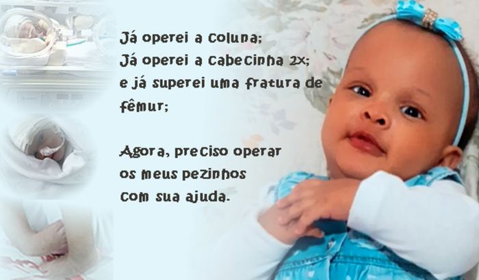 Eu sou a Nicoly, tenho 1 ano 5 meses de idade, e fui diagnosticada com mielomeningocele, hidrocefalia, malformação de Arnold Chiari tipo 2, ventriculomegalia grave (colpocefalia), defeito na migração neuronal classificada como heterotopia, luxação e adução bilateral do quadril, bexiga neurogênica e deformidade dos pés equinovaro mielodisplásico. Já realizei 4 cirurgias, uma na coluna, duas na cabeça e uma nos pés. Utilizo uma válvula na cabecinha para drenagem de líquido. Também utilizo órteses nos meus pezinhos.