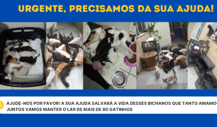 São mais de 80 gatos, muitas mães com filhotinhos, que do dia para a noite, podem VOLTAR a ficar TOTALMENTE ABANDONADOS a própria sorte na rua.E, dessa forma o trabalho de resgate também ACABARÁ, com muitos gatos DESAMPARADOS. Necessitamos URGENTEMENTE, pagar mensalmente o aluguel, pois caso contrário uma liminar pode nos DESPEJAR em 15 dias. Além disso, a despesa mensal para manutenção dos nossos mais de 80 gatos é altíssima.Há 6 anos cuidamos de gatos abandonados. Doamos mais de 120 filhotes e alguns adultos.