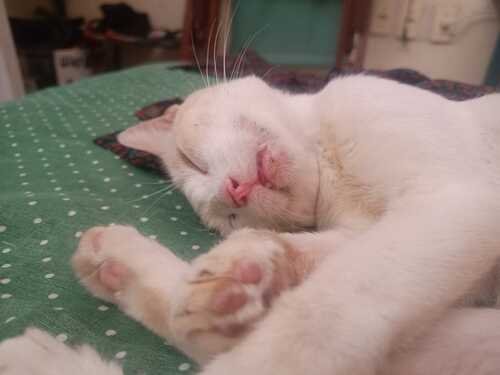 Eu era um gatinho muito amado por pelo meu dono quando era mais novo, mas a uns 5 anos ele faleceu e quem ficou não me quis mais e me abandonou. Algumas pessoas cuidavam de mim, mas eu sempre dormia na rua e brigava muito com os outros gatos, daí comecei a ficar fraquinho… Eu ficava doente com facilidade, meus dentes doíam muito quando eu comia ração, eu não respirava muito bem, parecia que eu estava sempre gripado.