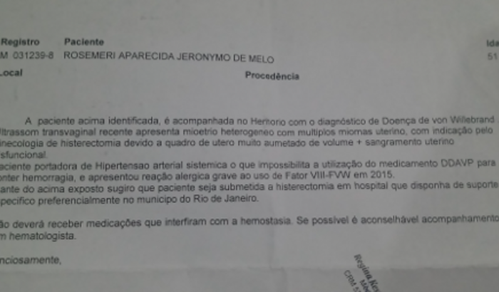 Eu me chama rosimeri tenho 51 anos e sou moradora de areal sou portadora da doença de vom wellebrand+mianatose uterina+hás com hemorragia com indicação de histerectomia com isso eu preciso fazer uma cirurgia mais pelo SUS está difícil de fazer fiz o tratamento por 5 anos no hospital universitário de vassouras onde a cirurgia foi marcada por 5 vezes mas não consegui fazer devido a doença no sangue e por ter alergia ao fator (ddavp) com a troca do medicação consegui no particular mas não tenho condições de pagar a cerurgia que custa 8.000.00 quem puder me ajudar com qual quer valor que seja eu agradeço emensamente de coração Deus poca abençoe todos vcs