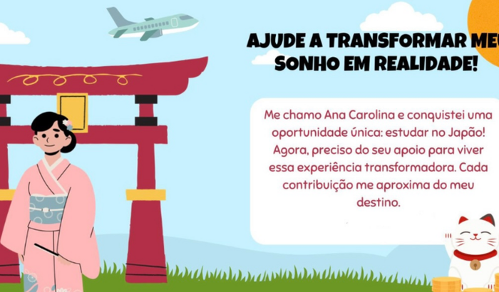 Oi, pessoal! Sou Ana Carolina e fui aprovada para estudar no Japão, através da UTFPR. Esse é um sonho que estou prestes a realizar, mas preciso da sua ajuda para lidar com os custos de moradia, alimentação e outras despesas. Qualquer contri ver tudo