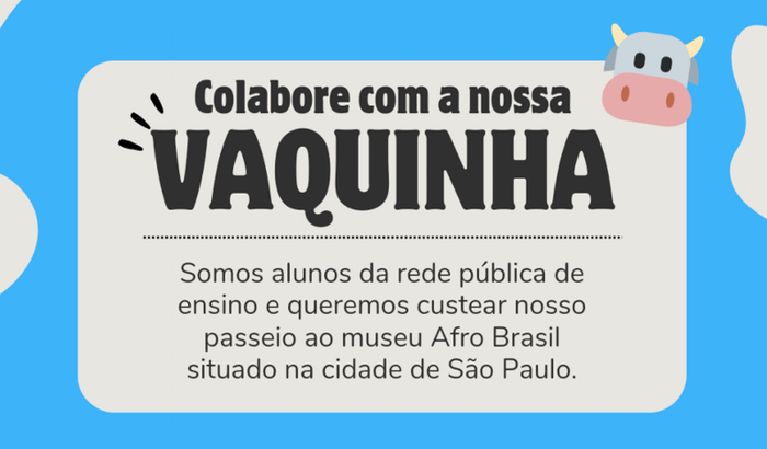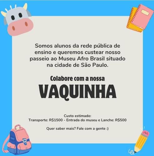 Motivo para arrecadar doações: Somos alunos da rede pública de ensino e estamos planejando um passeio educativo ao Museu Afro Brasil, localizado em São Paulo. Este passeio é uma oportunidade valiosa para expandirmos nosso conhecimento sobre a cultura afro-brasileira e a importância da diversidade na nossa sociedade.