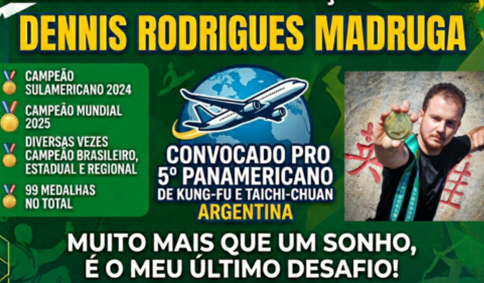 Meu nome é Dennis Rodrigues Madruga, 29 anos, atleta de Kung-Fu desde os 13 anos de idade.Estou na seleção brasileira de Kung-fu pelo terceiro ano consecutivo e fui convocado a disputar o Panamericano na Argentina, de 6 a 12 de outubro de 2026.Por ser um esporte não remunerado, necessito de apoio pra chegar ao campeonato e realizar mais esse sonho, fechando assim minha carreira nas competições.Hoje a passagem custa na faixa de 3000 reais e continua subindo, quanto antes conseguir comprar melhor(ainda não tenho informações sobre a hospedagem, pois o hotel será escolhido pela organização em uma data mais próxima do evento)-Campeão Mundial 2025-Campeão Sulamericano 2024, 2019, 2018-14x campeão nacional-13x campeão estadual-64x campeão regionalO único tÃtulo que me falta é o panamericano, do qual não pude participar antes por ter visto negado aos EUA, este ano será na Argentina e será a melhor opção possÃvel pra participar, por não precisamos de visto.Posso contar com seu apoio?