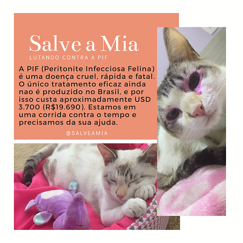 Oi gente! A Mia, nossa gatinha, foi diagnosticada com PIF (Peritonite Infecciosa Felina), uma doença cruel, rápida e fatal. A mia ainda anda, come e usa a caixinha, estamos no estágio inicial da doença e correndo contra o tempo para que consigamos iniciar o tratamento antes do quadro dela se agravar ainda mais. Acompanhar a progressão da doença, ver ela parar de brincar, andar pela casa e aprontar vem sendo um pesadelo. E a única medicação com eficácia para a cura da PIF é o Mutian, que por ainda não ser produzido no Brasil tem o valor inacessível para nós. O tratamento deve ser feito por 84 dias interruptos, pela tag #pifwarriors é possível acompanhar o tratamento e a cura de milhares de gatinhos por todo o mundo. (site da medicação : https://www.mutianstore.com/) Toda ajuda faz a diferença, por isso se puder contribuir, mesmo com pouco, seremos eternamente gratos. Nos ajudem a dar essa chance para a Mia! Acompanhe o tratamento e a prestação de contas pelo instagram @SalveAMia