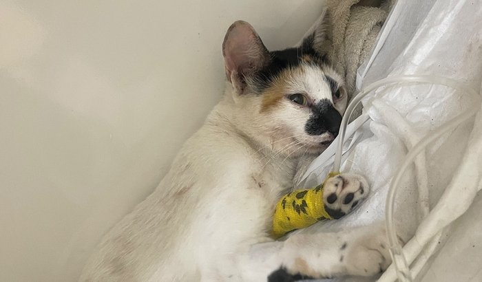 Ela estava muito machucada, com a boquinha ferida e bastante debilitada. Levamos imediatamente para a clínica veterinária, onde foi internada em estado delicado, com a pressão muito baixa e precisando de cuidados intensivos. No momento, ela está sendo medicada e monitorada constantemente. A veterinária suspeita de possíveis lesões internas, como perfuração de órgão ou fratura na região das costelas, e ainda serão necessários exames como hemograma, raio-x e outros procedimentos. O custo da internação é de R$ 200,00 por dia, além dos exames e tratamentos que ainda virão. Infelizmente, minha mãe não tem condições financeiras para arcar com tudo isso sozinha agora.