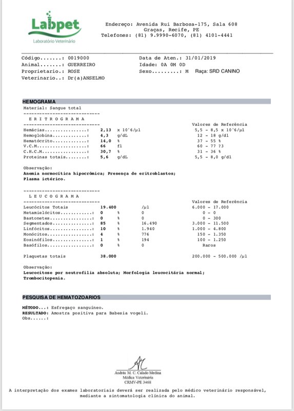 Guerreiro foi encontrado no Bairro do Curado, extremamente desnutrido, pele e osso, com muita dor e ferido. Suas feridas já tinham até larvas! Após muita luta, conseguimos levá-lo pra a clínica veterinária de Dr. Anselmo, localizada no bairro da Vazea (fone: 9 8835-0426), onde hoje se encontra internado e lutando para sobreviver! Seus exames constataram que está com babesiose, além dos ferimentos com necrose e milíase. Por isso, necessita ser tratado com antibiótico e ser hidratado.