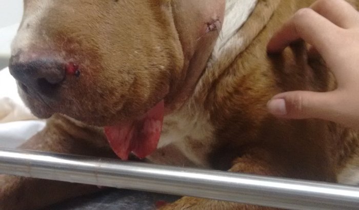 Pessoal esse é meu amigo tubarão, ele vive aqui na rua da minha casa. Ontem a noite um FDP monstruoso sacou uma arma e deu um tiro na boca dele, ele passou a noite sangrando e hj eu o resgatei e preciso de toda ajuda possível para o tratamento dele.