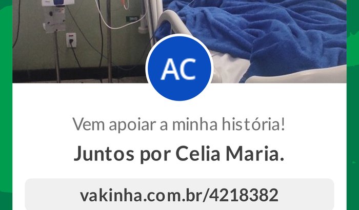 Ola, Sou Agda,Filha de Célia Maria e criei essa vakinha, para auxiliar no tratamento de saúde de minha mãe. A mesma já é idosa, passou por uma cirurgia da coluna, e possui outras comorbidades, como artrite rematóide, hipertensão e portadora de DPOC ( doença pulmonar obstrutiva crônica). Peço a ajuda de vocês para colaborar com o tratamento, reabilitação, medicamentos e acompanhamento fisioterapêutico.
