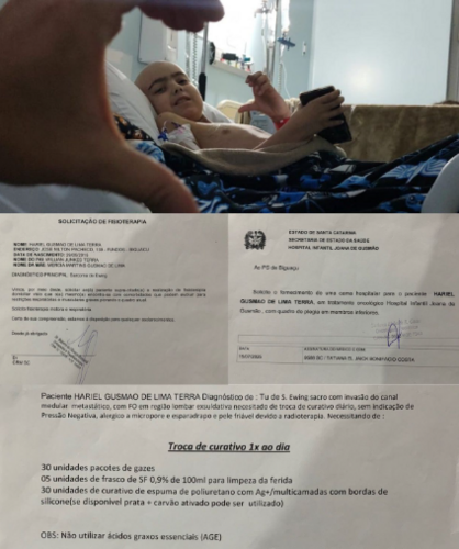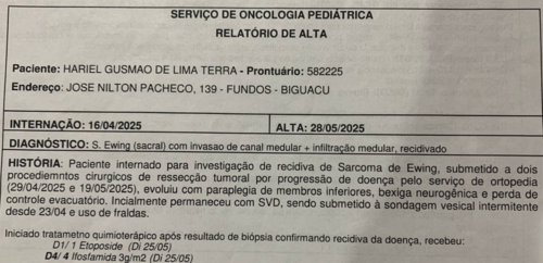 Um menino que teve o sonho interrompido por um Câncer⚽💔Olá, meu nome é Willian. Sou pai do Hariel, sou separado e tenho a guarda dele, um menino incrível de apenas 10 anos, cheio de sonhos e amor pela vida. Desde pequeno, o maior sonho dele sempre foi ser jogador de futebol. Infelizmente, esse sonho foi brutalmente interrompido por um câncer raro e agressivo: Sarcoma de Ewing (sacral).Tudo começou em julho de 2022, quando Hariel começou a sentir fortes dores nas pernas, principalmente na sola dos pés. Foram muitas idas e vindas ao hospital, sem diagnóstico. Apenas em outubro de 2022, após uma ressonância magnética, recebemos a notícia que nenhum pai gostaria de ouvir: câncer.Desde então, a nossa vida mudou completamente. Foram incontáveis sessões de quimioterapia, 48 sessões de radioterapia, várias cirurgias complexas na coluna para tentar conter os tumores — incluindo colocação de enxerto ósseo, pinos e parafusos de titânio — totalizando mais de 40 horas de cirurgias angustiantes.A última cirurgia, em maio de 2025, trouxe uma nova e dolorosa reviravolta: logo após o procedimento, descobrimos o retorno de um tumor ainda mais agressivo, que causou paralisia dos pés até um pouco acima do umbigo. Desde então, Hariel depende de cadeira de rodas, fraldas, sondas de alivio a cada 6 horas e cuidados contínuos com o sistema digestivo e urinário que foram 100% afetados.Na última internação, passamos 45 dias seguidos no hospital, voltando para casa apenas no dia do aniversário do Hariel, em 29/05.Diante da gravidade da situação e da necessidade de cuidados intensivos, tive que me afastar do meu trabalho como motorista, ficando sem renda, para poder estar ao lado do meu filho. Moramos apenas eu, Hariel e minha mãe, que infelizmente também tem problemas na coluna e não consegue mais cuidar do Hariel sozinha, (meu pai faleceu menos de um ano antes do diagnóstico do Hariel).Mesmo com todo o esforço, as más notícias continuam chegando. Após mais sessões de quimioterapia e radioterapia, uma nova tomografia revelou 3 novos tumores no cérebro. O tratamento atual não está mais surtindo efeito e está comprometendo a pouca imunidade que o Hariel ainda tem. Diante disso, com apoio da equipe médica, tomamos uma das decisões mais difíceis da nossa vida: interromper momentaneamente o tratamento e focar no que mais importa agora — dar conforto, dignidade e amor ao Hariel.Hoje, nossa rotina envolve idas constantes ao hospital consultas, exames e os cuidados paliativos, necessita de sessões de fisioterapia motora e respiratória, psicólogo, psiquiatra, curativos especiais (devido a uma necrose cirúrgica que ainda não cicatrizou), além do uso contínuo de outros equipamentos essenciais para o cuidado diário.💔 Por isso, venho aqui humildemente pedir a sua ajuda.Estou sem renda, e todas as despesas do tratamento, fraldas, transporte, alimentação, curativos, adaptações e despesas da casa estão se tornando impossíveis de manter sozinho.Qualquer valor que você puder doar fará uma enorme diferença na vida do Hariel.Se não puder ajudar financeiramente, compartilhe essa vaquinha com amigos e familiares. E, principalmente, nos inclua em suas orações.Com fé em Deus e com a força de pessoas como você, seguimos lutando todos os dias.Muito obrigado por ler até aqui.De coração,Willian Junkes Terra 🙏