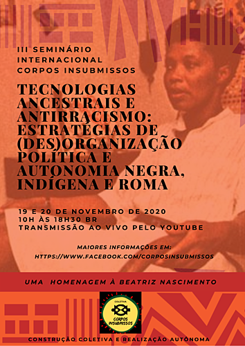 Somos um grupo de pesquisadoras e militantes negras brasileiras em diáspora e estamos organizando, de forma independente, o evento gratuito Seminário Internacional Corpos Insubmissos, que nesta edição tem por tema “Tecnologias ancestrais e antirracismo: Estratégias de (des)organização política e autonomia negra, indígena e roma¹", que acontecerá nos dias 19 e 20 de novembro de 2020, no formato webinário, conforme informações disponíveis na página Corpos Insubmissos, no facebook.
