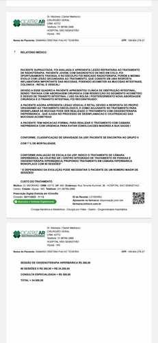 Em janeiro de 2018 fui diagnosticada com CA de colo de útero, precisei de 25 transfusões de sangue, radioterapia, quimioterapia, braquiterapia, 9 cirurgias e usei bolsa de colostomia. Infelizmente fiquei com bastante sequelas devido ao tratamento muito forte… de alguns meses pra cá as minhas dores tem sido cada dia pior e apenas morfina para consegui controlar as dores… nisso os médicos começaram a investigar e achando muitas sequelas. Foi encontrado uma parede que separa dois órgãos muito importantes em camada muito fina devido a radioterapia e preciso começar o tratamento o mais rápido possível para poder evitar esse rompimento, e preciso de 90 sessões de Câmara Hiperbárica sendo cada sessões R$380,00 cada preciso de 1 por dia. Conto com ajuda de vocês. Muito obrigada 🙏