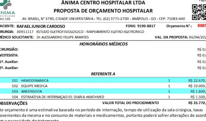 Me chamo Rafael tenho 35 anos, sou casado tenho uma filha de 18 anos, trabalho em uma pequena mercearia em anapolis Goiás, no dia 22/12/2022 fiz um eletrocardiograma de rotina e acabei descobrindo um problema cardíaco (Pré excitação Ventrícular ) mediante esse resultado realizei mais alguns exames e recebi o diagnóstico de Síndrome Wolf Parkinson White, que pode causar morte súbita, por isso fui orien pelo cardiologista a realizar 3 procedimento, estudo eletrofisiológico , Mapeamento, Ablação convencional e infelizmente não tenho condições para realizar estes procedimento, e como tenho síndrome do pânico, depressão já em tratamento a 2 anos, com esse problema cardíaco acabou atrapalhando muito a minha vida Psicológica pois me causa muita aflição e angústia e medo de morte por isso vim aqui pedir sua ajuda, e que Deus abençoe nossa vida sempre.