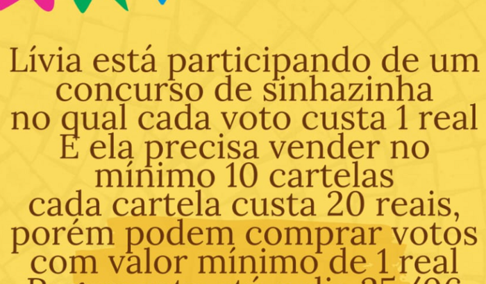 Criei esua vakinha para minfantil filha de 4 anos que está participando de um concurso de sinhazinha para a escola e a quantidade mínima são de 10 cartelas, cada cartela custa 20 reais e cada voto um toda ajuda será bem vinda