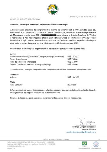 Diante meus resultados fui convocada pela Seleção Brasileira, tendo assim a oportunidade de realizar um sonho de representar nosso país no 9º CAMPEONATO MUNDIAL DE KUNGFU, evento que acontecerá em agosto na cidade EMEISHAN na CHINA.