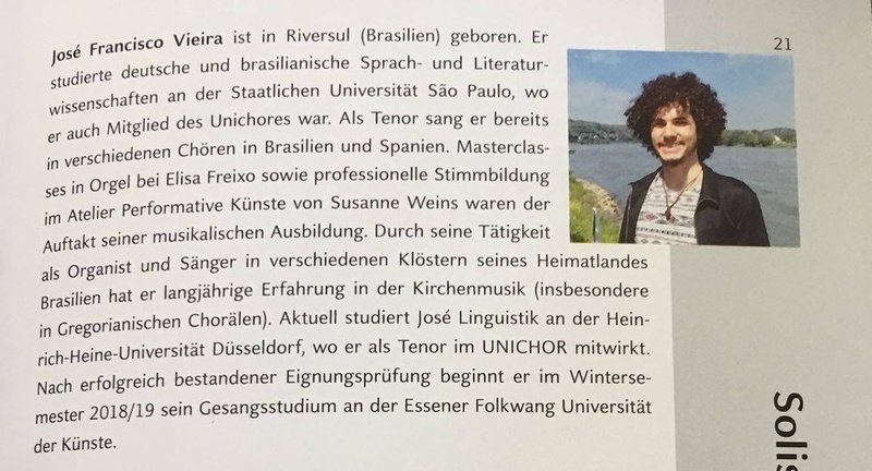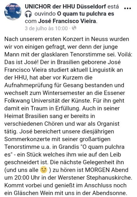Publicação na página do Facebook do Unichor da HHU em que sou apresentado como solista dos concertos de verão de 2018.