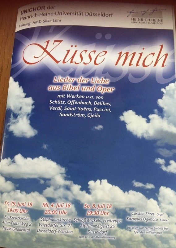 Além disso, este ano fui convidado para participar do KölnChor da cidade de Colônia, Alemanha, cantando na produção do concerto Final Fantasy XIV, juntamente com a Neue Philarmonie Westfalen. O concerto se deu na Konzerthaus da cidade de Dortmund, sob a regência de Wolfgang Siegenbrink e Alexandra Cravero. Também no coro universitário da Heinrich-Heine-Universität Düsseldorf, sob a regência de Silke Löhr, participei não somente como membro do coro, mas também como solista em 3 concertos nas cidades de Neuss e Düsseldorf. O vídeo da descrição mostra o solo que apresentei no concerto de verão deste ano no Schloss Mikeln, em Düsseldorf.